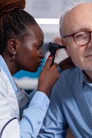 Close up of black doctor using otoscope for ear checkup examination on old patient in cabinet. African american otologist holding medical steel instrument for healthcare consultation