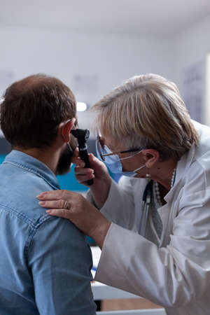 Specialist holding otoscope to do ear examination on senior woman, wearing face mask. Physician using otolaryngology intrument at checkup consultation with patient during covid 19 pandemic.