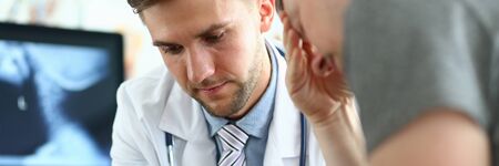 Portrait of serious doctor indicating bad diagnosis to sad and unsettling patient. Man explaining to visitor treatment method. Medicine and healthcare concept. Blurred background