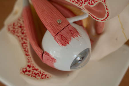 Close-up of an anatomical plastic model of the human eye.