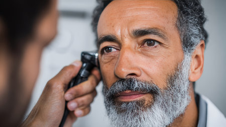 A mature man with a salt-and-pepper beard is examined for hearing issues using an otoscope in a modern doctor's office. The setting features soft neutral colors, creating a professional vibe.