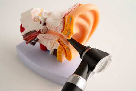 Otoscope with ear model for otolaryngologist or ENT physician doctor examining senior patient ear, hearing loss problem.