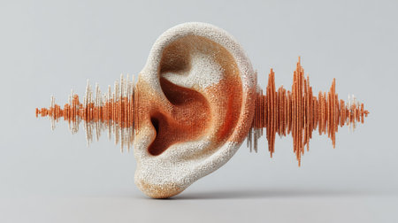 A close-up captures a human ear, highlighted by a glowing sound wave graphic. The image presents a blend of soft focus and sharp detail. Warm, golden tones illuminate the scene, suggesting a digital or conceptual artwork appropriate for educational and commercial applications.