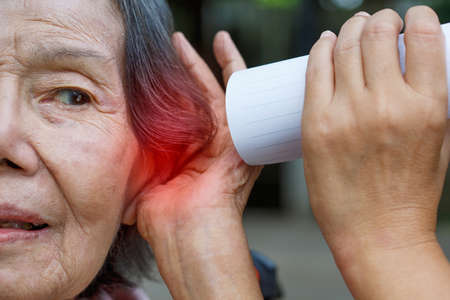 Senior woman plugging index finger into her ears, Grey curly hairs, Swimming pool background, Close up & Macro shot, Selective focus, Asian Body part, Healthcare concept, Symptom of hearing loss