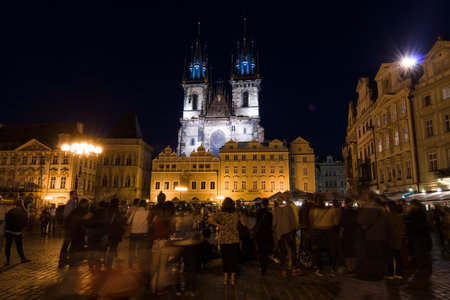 Tourists on The Old Town Market Square and Church of Our Lady Before Týn in Prague, Czech Republic