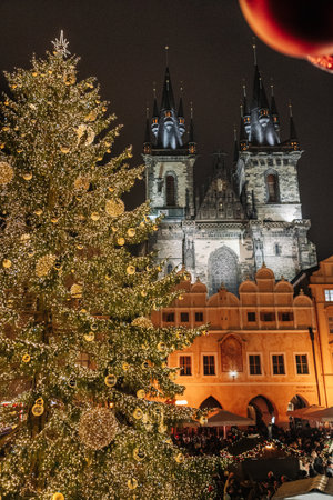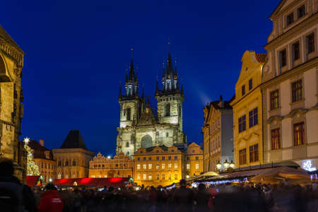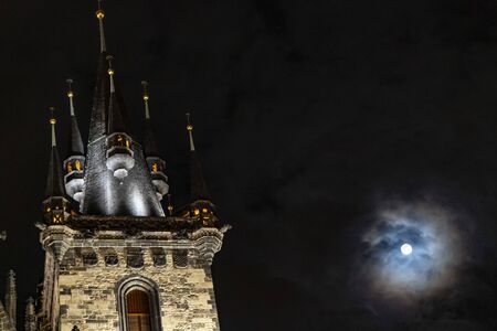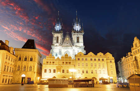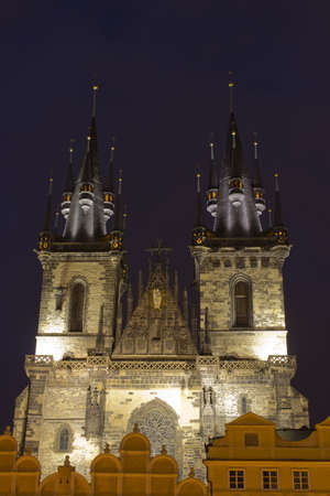 Famous Tyn Cathedral Twin Tower at night illuminated on Prague Town Square Czech Republic Europe