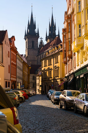 Prague Tyn Cathedral sunset view from old town street, Czech Republic
