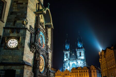 Astronomical Clock and the Church of Our Lady Before Tyn in Prague Old Town at Night