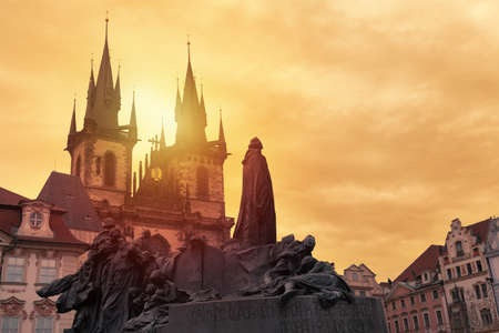 Church of Our Lady Tyn and Jan Hus statue from Old Town Square Staromestska Prague at sunset. Prague landmarks