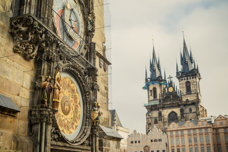 Cityscape view on the clock tower and Tyn cathedral during the sunrise in the old town of Prague