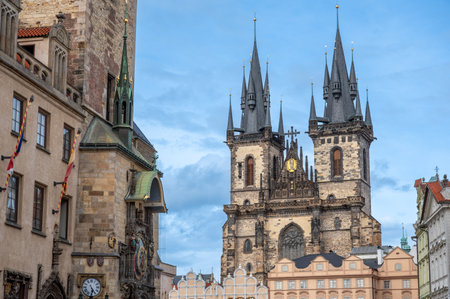 Prague, Czech Republic, August 7, 2023.Iconic shot of the Old Town Square. Summer day,with the tower housing the astronomical clock on the left, the Church of Our Lady before Tyn on the right.