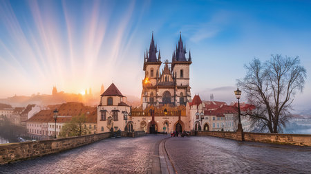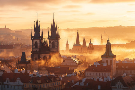 Enchanting sunrise over prague skyline iconic spires, medieval architecture, and dreamy fog