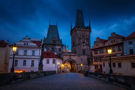 Morning view of Charles Bridge and Lesser Town Bridge Tower in historical centre of Prague.