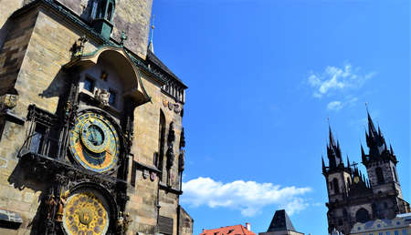 Ancient and historical buildings in Prague City. Czech Republic. The most famous historical buildings in Prague. Clock tower with blue sky background.