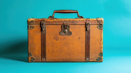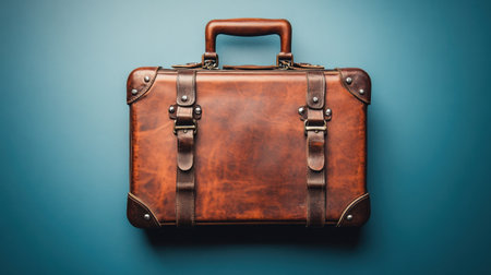 A beautiful vintage leather suitcase with metal accents rests on a blue background, reflecting classic design elements ideal for travel-inspired creative projects.