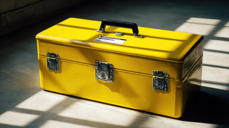 The bright yellow toolbox sits on a concrete floor, illuminated by sunlight streaming through nearby windows, highlighting its bold color and robust build.
