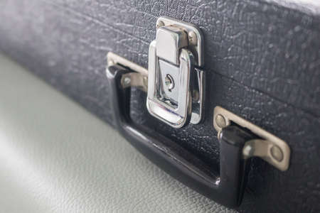 Old vintage suitcase in the room. The suitcase handle. Foreground, horizontal photo