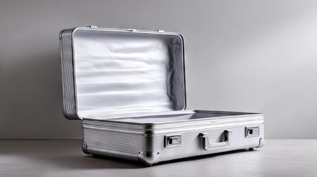Empty brushed aluminum suitcase on a light gray background, emphasizing its modern design and spacious interior