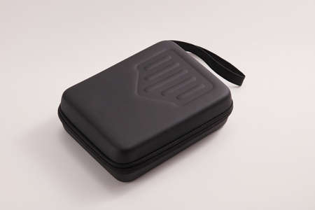 close-up, partial details accessories photography, partial view electronic agenda, partial view detail photometer, with lens in the background and waterproof case, black backgroundclose-up, partial de