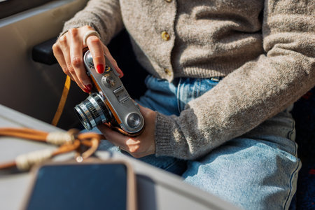 Retro camera in the hands of a girl close-up outdoors