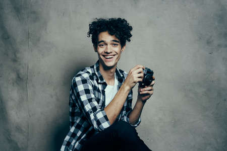 handsome guy with a camera near his face and curly hair plaid shirt hobby photographer