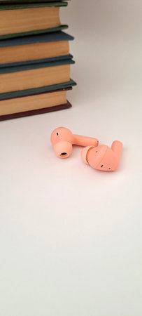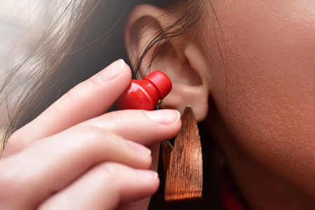 A woman holds a red wireless earphone in her hand, bringing it closer to her ear to listen to music. close up view