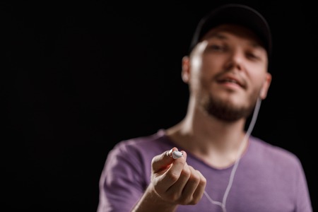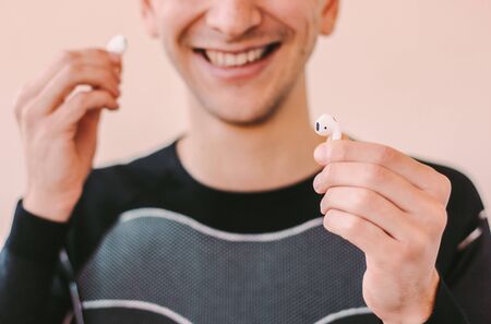 Closeup happy sports man wearing wireless earbuds and smiling at home. Young fitness man holding earphones in hands. Listening music for motivation, inspiration while exercising or running