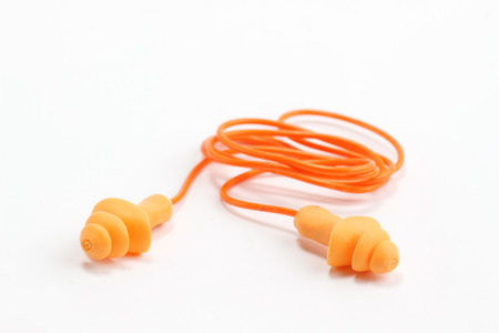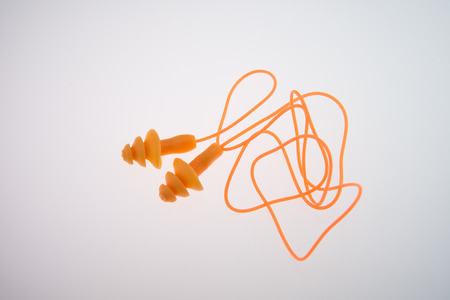 Ear plugs isolated on white background. Orange ear plugs isolated. Selective focus.