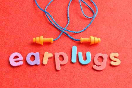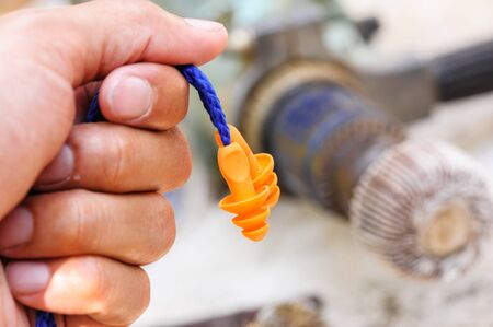 Orange reusable ear plugs in construction site, personal safety equipment concept. Outdoor shooting and shallow depth of field.