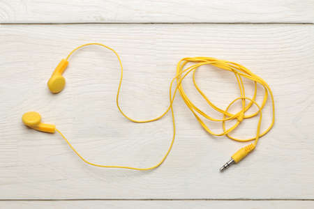 Small yellow headphones for a smartphone on a white wooden background. top view
