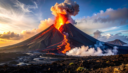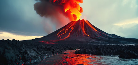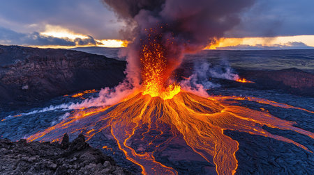 captivating scene of an active volcanic eruption, showcasing molten lava, smoke plumes, and fiery glow beneath a dramatic evening sky, exuding intense energy and natural grandeur.