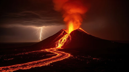 Fiery volcanic eruption with lava flows at night. Concept of active volcano, natural disaster, geological phenomenon, extreme environment.