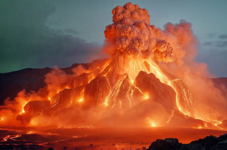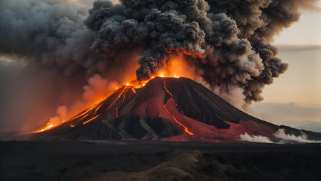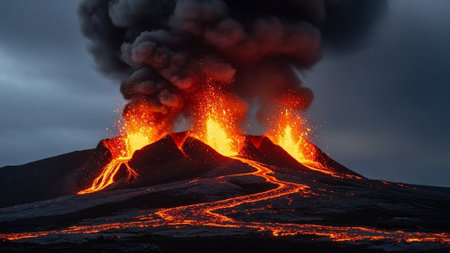 Massive volcanic eruption with fiery lava and dense smoke