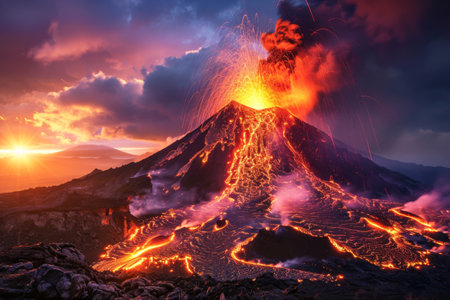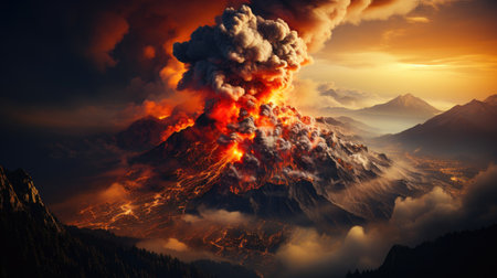 AI Generated. Majestic volcano erupting at sunset with dramatic smoke and lava flow illuminating the sky and landscape in vibrant orange hues