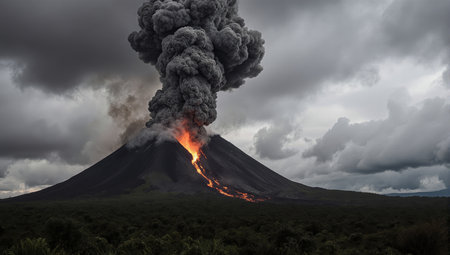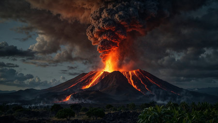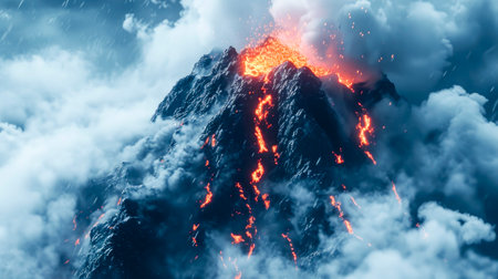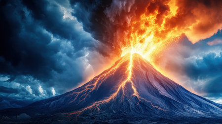 Volcanic eruption with a backdrop of a stormy sky, nature's fury unleashed