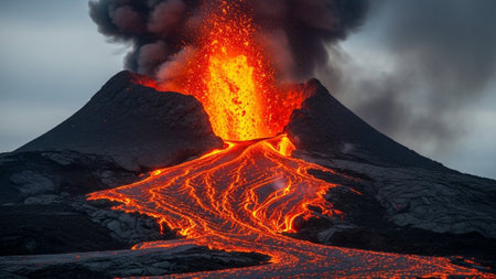 Active volcano erupts, spewing molten lava and dense smoke into sky. Concept of geological activity and force of nature