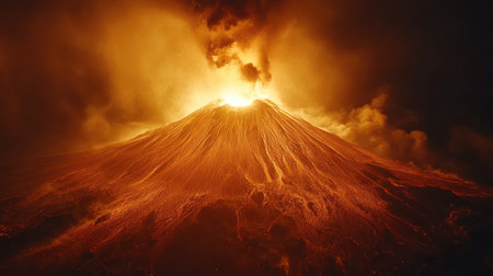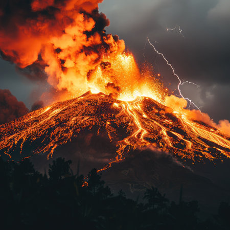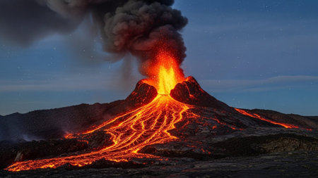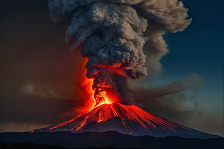 A stunning eruption brightens the night as lava flows and ash clouds soar, creating a breathtaking spectacle.