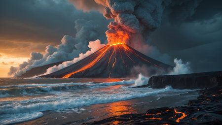 Volcanic eruption meeting ocean, showcasing fiery contrast