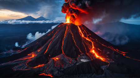 Stunning eruption of a volcano, showcasing fiery lava and plumes of smoke against a twilight sky.