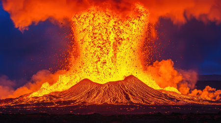 A powerful volcanic eruption spews a fountain of molten orange lava high into the air from a crater. The intense heat and chaotic splashes of magma illustrate the raw and destructive force of nature.