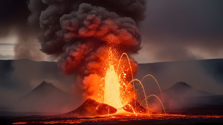 Massive volcanic eruption spewing lava and volcanic ash into the sky