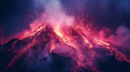 A powerful volcano erupts spectacularly, spewing fiery lava and creating a dramatic scene filled with smoke and vibrant colors against a dark sky.