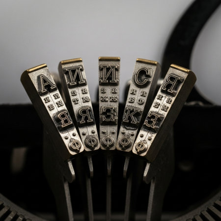 Extreme macro view, square 1:1 composition, focused intensely on the metallic type slugs of a vintag