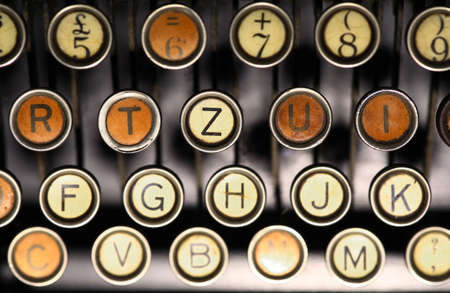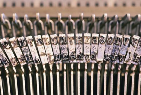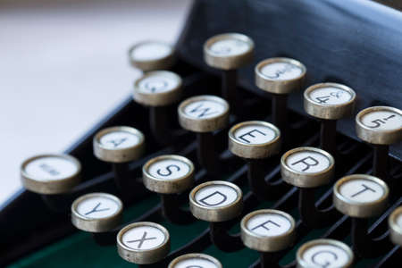 close-up view from above of the dusty keys of an old typewriter. Old mechanical tool for writing. Journalism and storytelling
