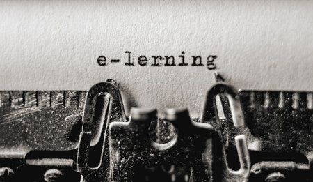 Printed text E-lerning on retro typewriter. Vintage typography font on white paper