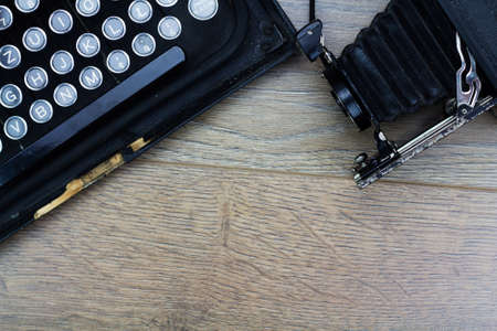 Overhead image of an old fashioned vintage typewriter with bellows camera