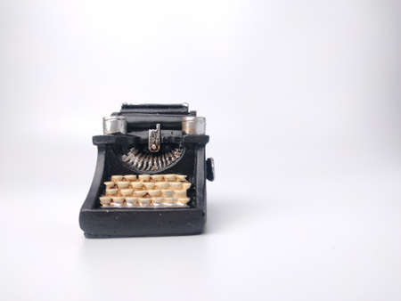 People hands typing an old Thai traditional typewriter. Classic vintage antique manual typing machine isolated on white background. 19th century item. Lifestyle
