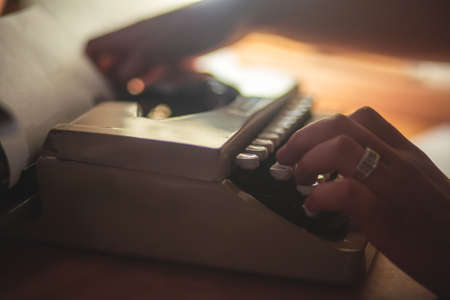 woman typing on a typewriter presses the carriage return lever. high quality photo