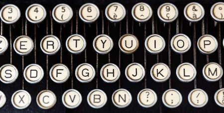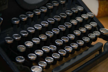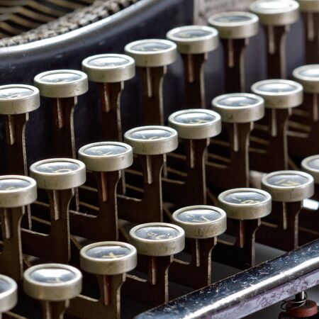 Round keys of an old typewriter seen from above. Mechanical tools for writing. Old time journalism