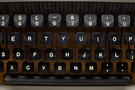 Close up English alphabet on keyboard of vintage retro typewriter, classic antique equipment for create and wording on paper.